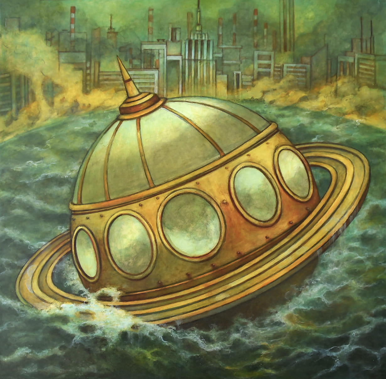 Despite its relatively small scale, the painting carries a strong emotional presence. At the center of the composition is a delicate vessel navigating turbulent waters while a city burns behind it.