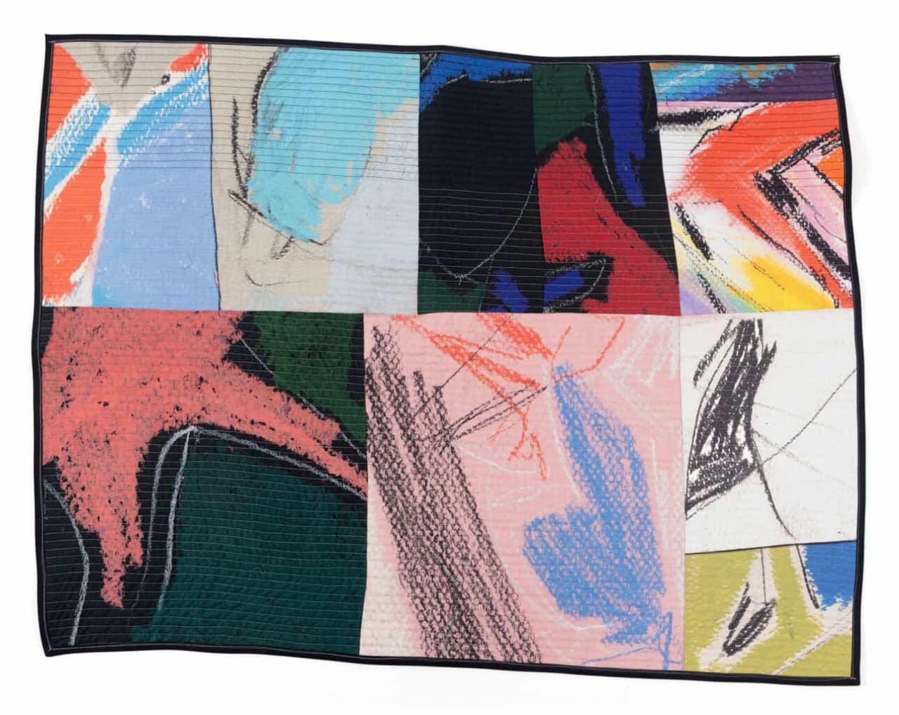 Stitched divisions interrupt and organize the composition, acting as pauses within urgency. These seams suggest both containment and vulnerability, reinforcing the idea of endurance under pressure. The quilted surface becomes a record of emotional labor, a visual manifestation of what it means to persist while navigating frustration and uncertainty.