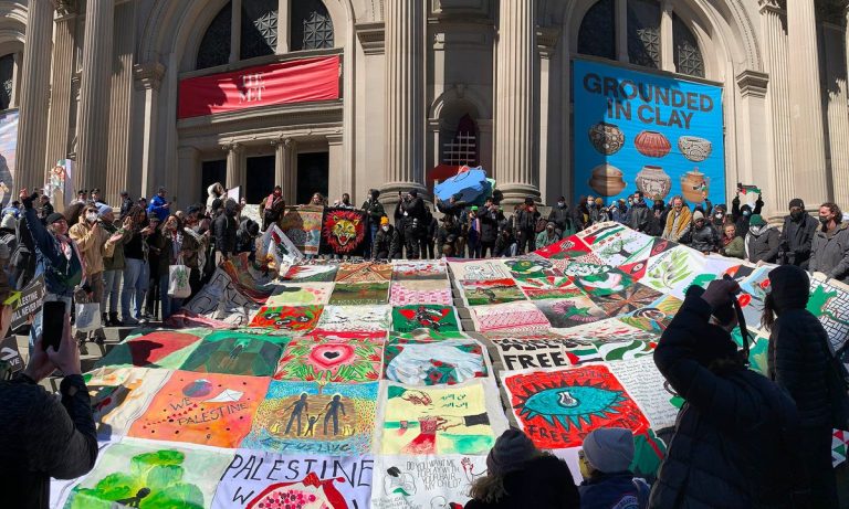 Hundreds of artists, cultural workers and activists gathered on the steps of the Metropolitan Museum of Art on New York’s Fifth Avenue on Sunday (March 24) to publicly call for the most visited museum in the US to call for a ceasefire in the war in Gaza. and undertake to preserve the cultural heritage of Palestine. Demonstrators unfurled a 30-by-50-meter quilt with designs sewn, painted and printed by more than 60 artists expressing solidarity with the Palestinians.