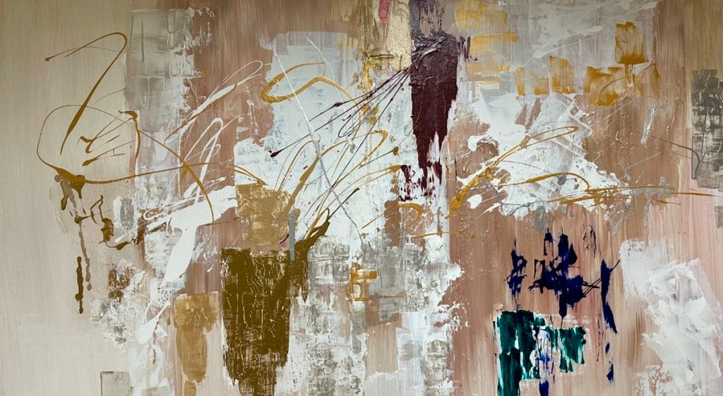 Stormie uses plaster and flotrol to create depth and texture, giving the work a tactile quality. The colors are muted yet rich, with streaks of gold and silver peeking through, as if hinting at treasures buried beneath life’s challenges. There’s a quiet elegance in this piece, a reminder that what we often overlook holds the greatest value.