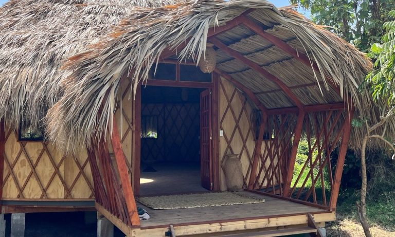 The center is located on farmland previously owned by Gutierrez’s grandfather. Over the past 14 years, the farm has been replanted in a forest and meadow, with unique and fantastical structures dotting the landscape. There are small earthen envelope buildings shaped like massive coiled pots—a technique Gutiérrez learned from Iranian-American architectural pioneer Nader Khalili. Other structures are made of mud bricks and thatched roofs. They are fully functional homes with composting toilets, sheltered from the elements and beautiful interior frescoes. The center features a self-built gray water system, a geodesic domed office space and a sprawling bamboo structure with a sand floor and a fire burning in the center. Gutiérrez refers to it as a “house of thought” where visitors can cathartically scatter tobacco leaves into the fire.
